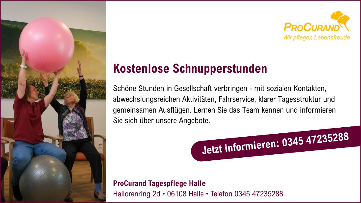 If you are interested in one of the 20 places in the ProCurand day care centre in Halle, simply make an appointment for an initial consultation. Our team will be happy to answer all your questions about day care and give you detailed advice. It is important to us that you get to know ProCurand, the competent day care team and the other day guests - ideally during a non-binding, free trial day.