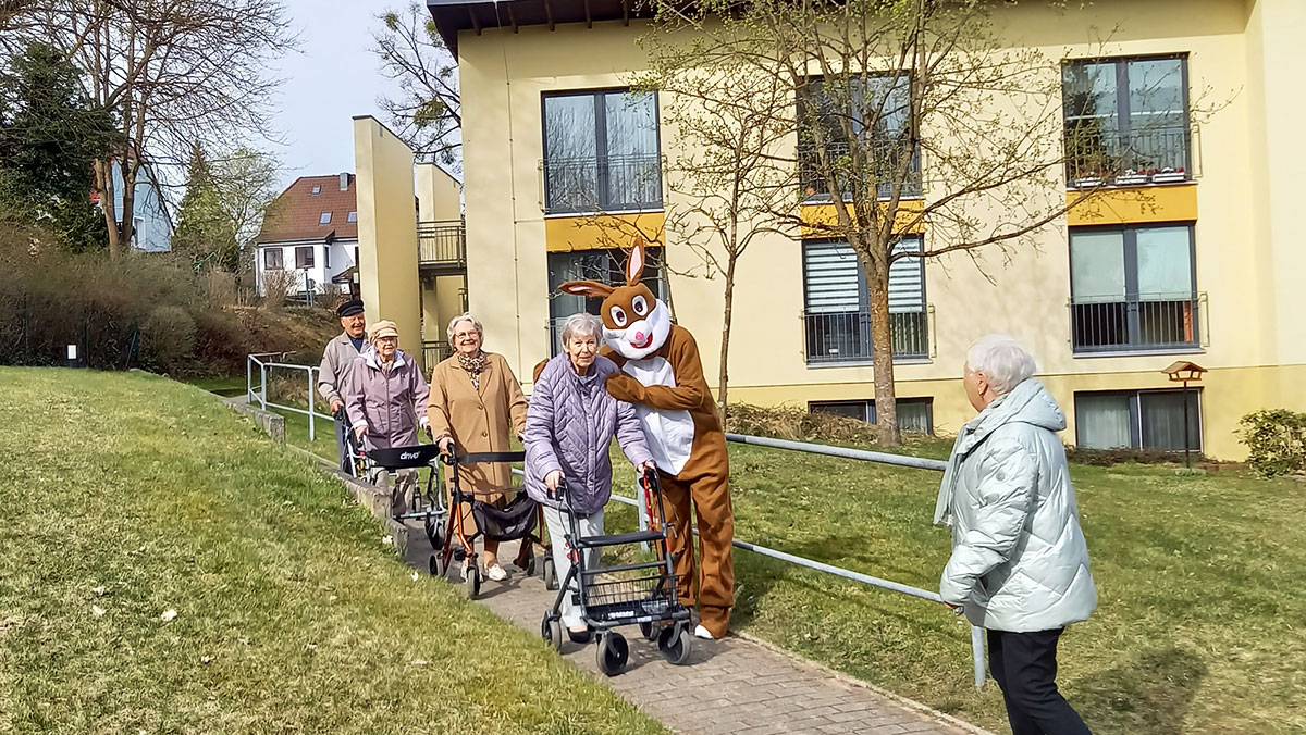 Am Ostersamstag trafen sich die Bewohner*innen sowie die Mieter*innen zum traditionellen Osterfeuer im Park. Beim Grillen verbrachten sie gemeinsam Zeit im Freien. Am Ostersonntag war der Osterhase zunächst im Park unterwegs und sorgte für kleine Überraschungen. Anschließend besuchte er die Wohnbereiche und verteilte Geschenke – auch an diejenigen, die ihre Zimmer nicht verlassen konnten. Am Ostermontag gestaltete Alf Weiss, „The Charming Voice“, das musikalische Programm. Es wurde getanzt und geschunkelt.