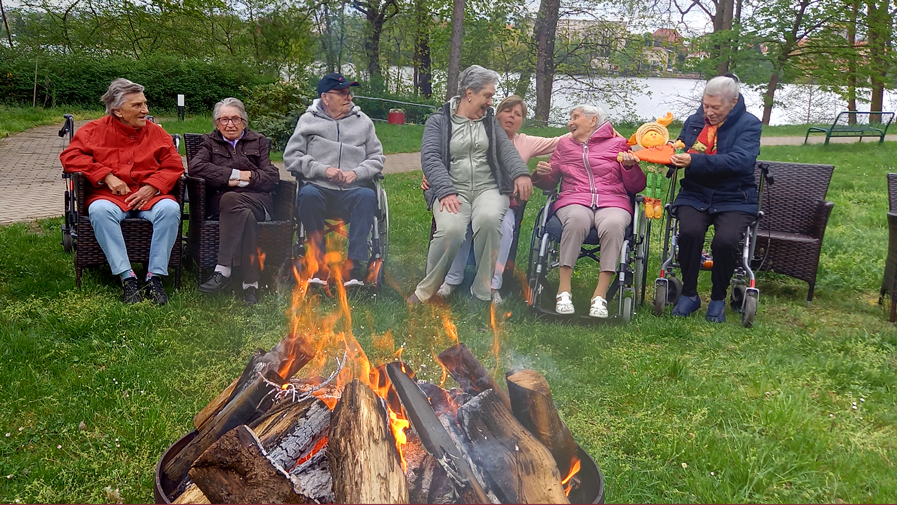 Am Karfreitag startete das diesjährige Osterfest der ProCurand Seniorenresidenz Am Straussee mit einem Grillnachmittag aller Lebensbereiche (Wohnbereiche). Es gab leckere Bratwürstchen vom Grill mit Kartoffelsalat und alle erfreuten sich an dem geselligen Beisammensein. Ostersamstag konnten sich unsere Bewohner*innen trotz des kühlen Wetters am Osterfeuer im Park erfreuen – und vor allen Dingen aufwärmen! Auch an diesem Tag wurde wieder gegrillt und geschlemmt, besonders gelobt wurde der Kartoffelsalat mit grünem Beelitzer Spargel. Bei einer Portion blieb es selten.